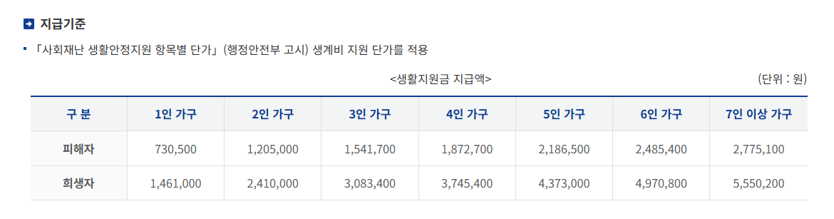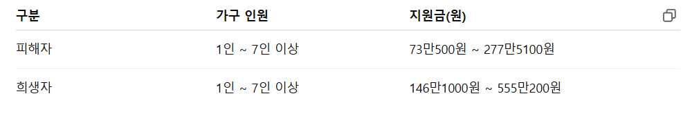 지원금은 가구원 수에 따라 차등 지급 되며, 희생자와 피해자 각각 금액 기준이 다릅니다.