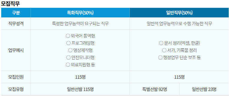 일반 직무 총 115명 모집하며, 특화직무 총 115명을 모집합니다