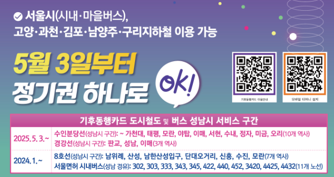 서울시가 도입한 무제한 대중교통 정기권, 기후동행카드가 2025년 5월부터 경기도 성남시 지하철에서도 사용 가능해집니다.