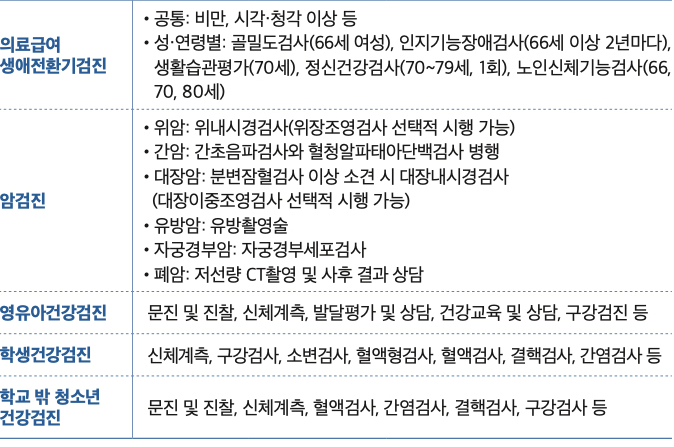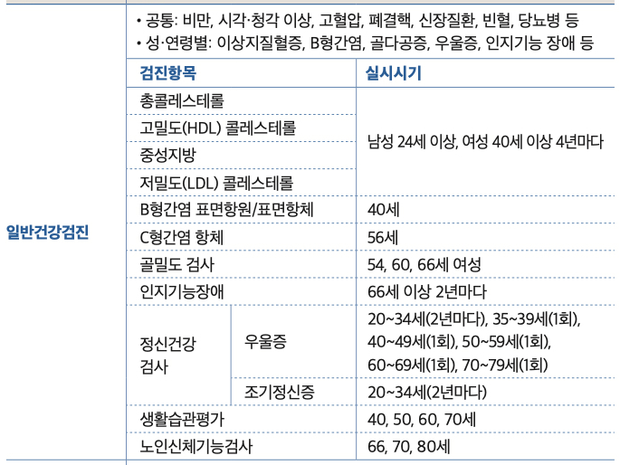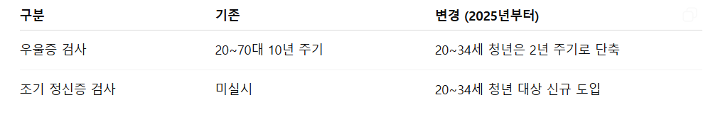 특히 2025년 부터는 심리적문제, 간질환, 골다골증 등 사회적 문제로 부각되는 질환에 대한 조기 진단이 강화되었습니다.