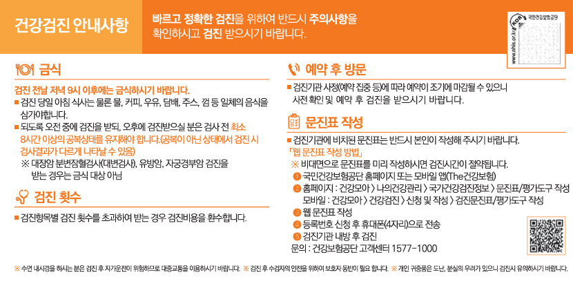 검진 전날 저녁 9시 이후 물을 제외한 금식은 필수이며 오전 검진을 권장하고, 병원 방문시 신분증, 건강보험증 지참하여야 합니다.