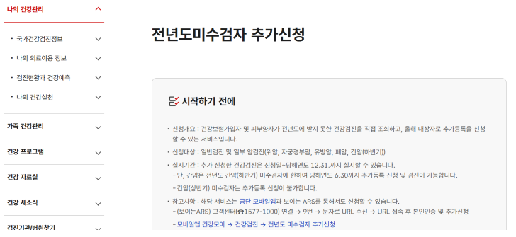 이 외에도 전년도 검진을 받지 못한경우 미수검자 추가신청을 통해 올해 검진에 참여 할 수 있습니다.