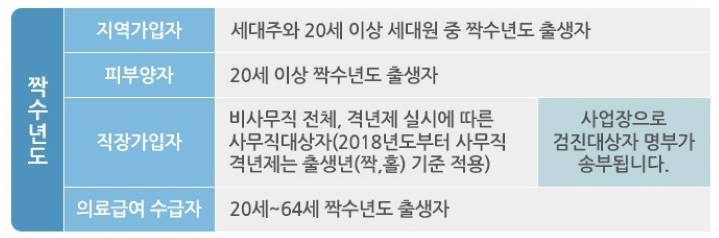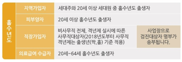 국가 건강검진은 2년 주기로 제공되며, 대상하즌 출생연도에 따라 홀수-짝수년으로 나누어 선정됩니다.