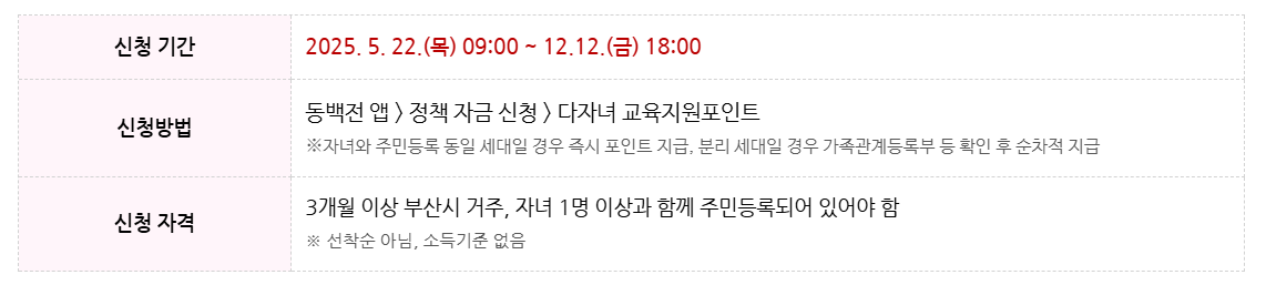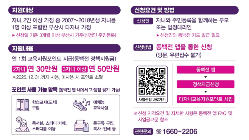 부산시와 부산시교육청이 저출생 문제 대응 및 교욱복지 강화를 위한 실질적인 대책으로 다자녀 교육지원포인트 사업을 본격적으로 시행합니다. 이 정책은 다자녀 가정의 교육비 부담을 덜고 자녀 교육기회를 확대하는 데 중점을 두고 있으며, 신청은 2025년 5월 22일 부터 12월 12일까지 진행됩니다. 소득이나 재산에 관계없이 신청 가능한것이 특징이며, 지급 포인트는 부산 지역화폐인 동백전으로 제공됩니다.