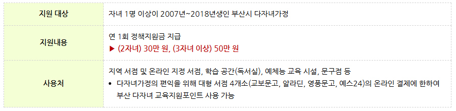자녀 1명 이상의 2007년 2018년 사이에 출생한 초,중,고교 학령기의 자녀를 둔 부산시 거주 다자녀 가정을 대상으로합니다. 신청일 기준으로 부산시에 최소 3개월 이상 거주하여야 하며, 2자녀 가정은 30만원, 3자녀 가정은 50만원 부산 지역 화폐 동백전의 정책지원금 형태로 지급 됩니다.