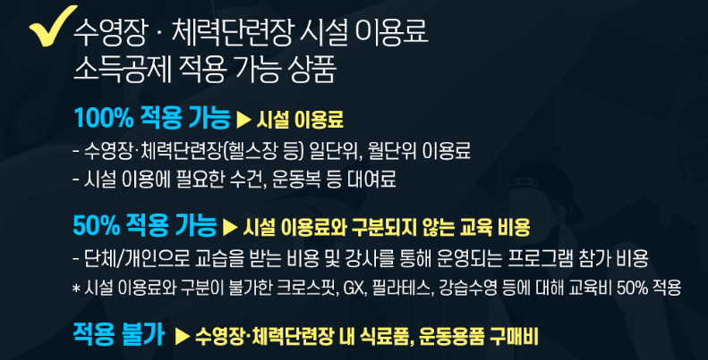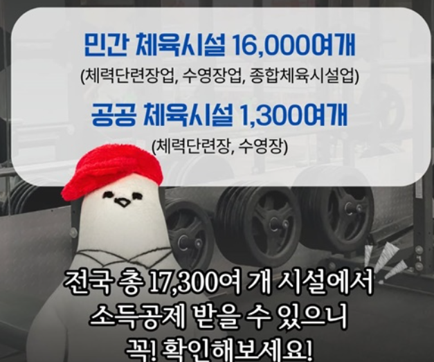 민간체육시설과 공공체육시설까지 포함됨에 따라 지역 주민센터, 국민 체육센터, 구민회관 등에서 운영하는 수영장, 헬스장도 소득 공제를 받을 수 있습니다.