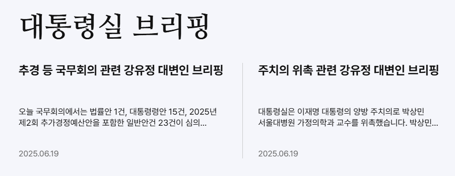 아울러 대통령실 대변인실에서 제공하는 공식브리핑 자료와 정책 발표 내용도 홈페이지를 통해 확인 할 수 있습니다