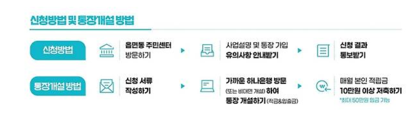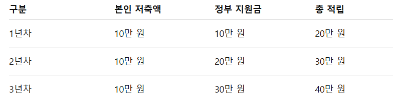 저축금은 10만원~ 50만원까지 선택 가능하나, 정부 지원금은 본인 저축액 10만원 기준입니다.