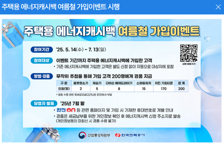 에너지 소비가 급증하는 여름을 맞아, 한전은 에너지캐시백 가입자 대상 경품 이벤트를 개최합니다.