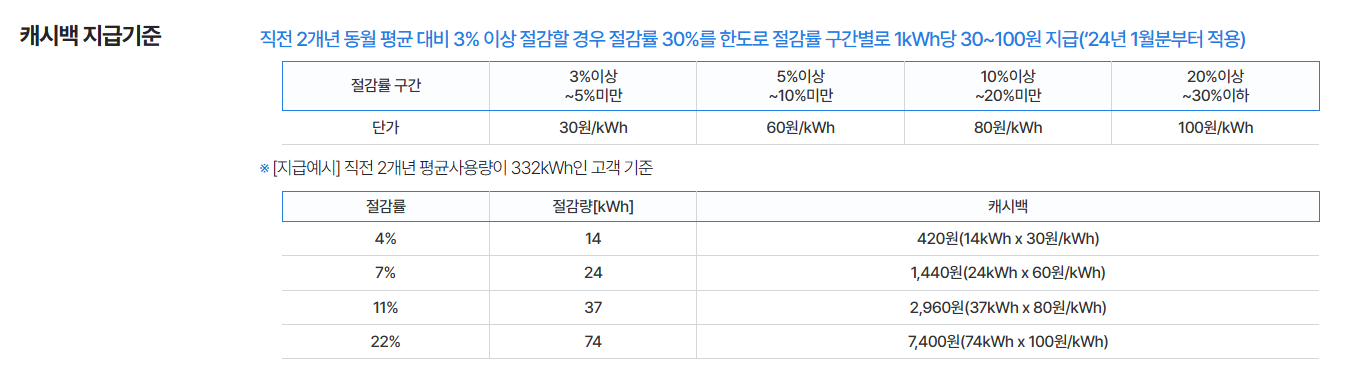 직년 2개년 같은 달의 평균 사용량 대비 3% 이상 줄여야 캐시백이 발생합니다.