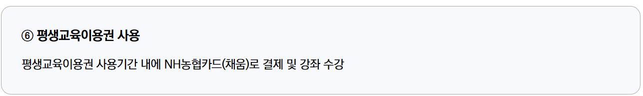 이용권은 카드포인트 형태로 지급되며, 평생교육기관에서 수강료나 교재비를 결제할 때 자동으로 포인트가 차감되는 방식으로 사용됩니다. 따라서 별도의 현금 지출없이 등록된 교육기관에서 간편하게 결제 할수 있습니다.