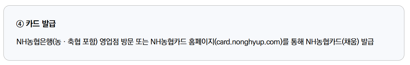 기존에 채움카드를 소지하고 있다면, 그대로 사용가능하지만 만약 해당 카드가 없다면 이용권 선정 이후 농협 영업점을 방문하여 새로 발급받아야합니다.