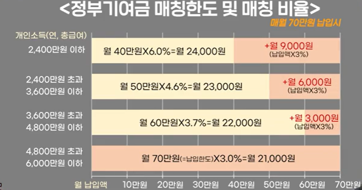 또한, 납입 금액의 3%에서 최대 6% 수준까지 정부가 매월 일정 금액을 추가 지원해 주며, 이는 개인의 소득 수준 및 가구 중위소득 기준에 따라 차등 적용됩니다. 소득이 낮을 수록 더 많은 지원을 받을 수 있기 때문에 취약 계측일 수록 유리합니다.