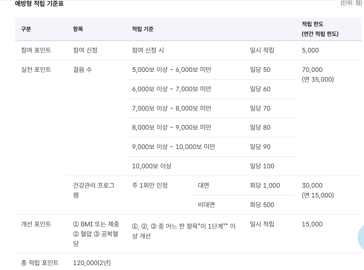 예방형 참여자는 하루 5,000보 이상 걷기 실천 시 최대 100점씩 포인트를 적립할 수 있으며, 연간 최대 35,000점까지 받을 수 있습니다. BMI, 혈압, 공복혈당 등 건강수치가 개선되면 최대 15,000의 인센티브가 추가로 지급 됩니다. 전체적으로 2년간 최대 12만점까지 적립이 가능합니다.