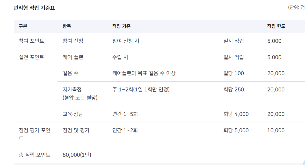 관리형 참여자는 주치의와 케어플랜을 수립하면 5,000점을 받고, 목표 걸음 수 실천, 혈압, 혈당 자가측정, 상담참여 등 항목별로 연간 최대 2만점 까지 적립이 가능합니다. 정기적인 건강 평가에 참여하면 추가로 최대 1만점이 지급되며, 연간 총 8만점까지 받을 수 있습니다.