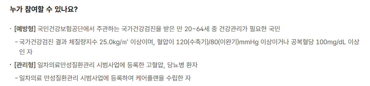 예방형 참여자는 건강검진 결과 특정 수치가 위험 수준 이상인 사람이며, 관리형 참여자는 이미 고혈압 또는 당뇨 진단을 받고 만성질환관리 시범사업에 등록한 환자로 나뉩니다.