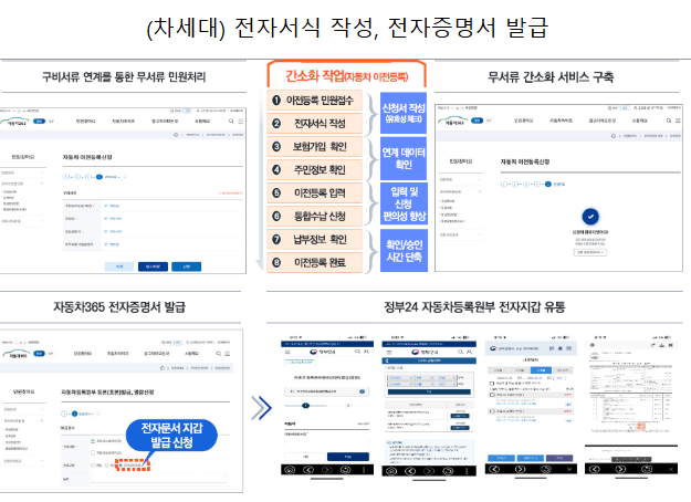 예를 들어, 중고차를 구매한 후 자동차 등록이 필요하다면, 이전에는 관할 차량등록사업소를 방문해 양도증명서, 위임장, 인감증명서 등을 출력해 제출해야 했습니다. 하지만 새 시스템에서는 스마트폰으로 접속, 본인인증, 차량 정보 입력, 등록수수료결제, 전자문서지갑으로 등록증 발급까지 5분이면 끝납니다.