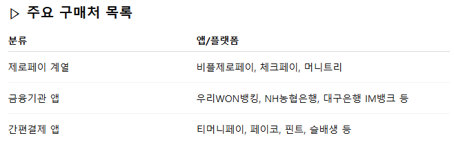 비플제로페이, 머니트리, 체크페이 등 제로페이 계열의 앱에서 구매 가능 하며, NH농협은행 앱 등 은행 앱, 페이코, 티머니페이등 에서도 구매 가능합니다.