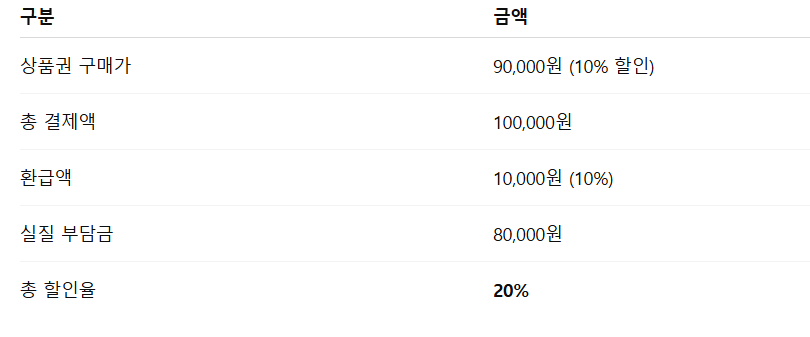 예를 들어, 한 주 동안 8만원의 상품권을 결제하면 10%에 해당하는 8,000원이 다음 주에 환급 됩니다.