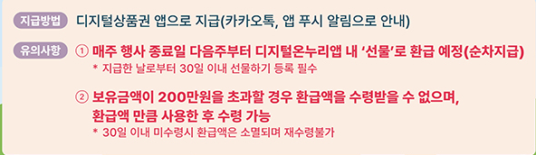 보유한 상품권 한도 초과시 수령이 불가합니다. 환급금 지급 시점에 디지털 온누리상품권 보유 잔액이 200만원을 초과하면, 환급금 수령이 불가능합니다. 이 경우 보유 금액을 일부 사용한 후에 다시 선물받기를 통해 수령해야 합니다.